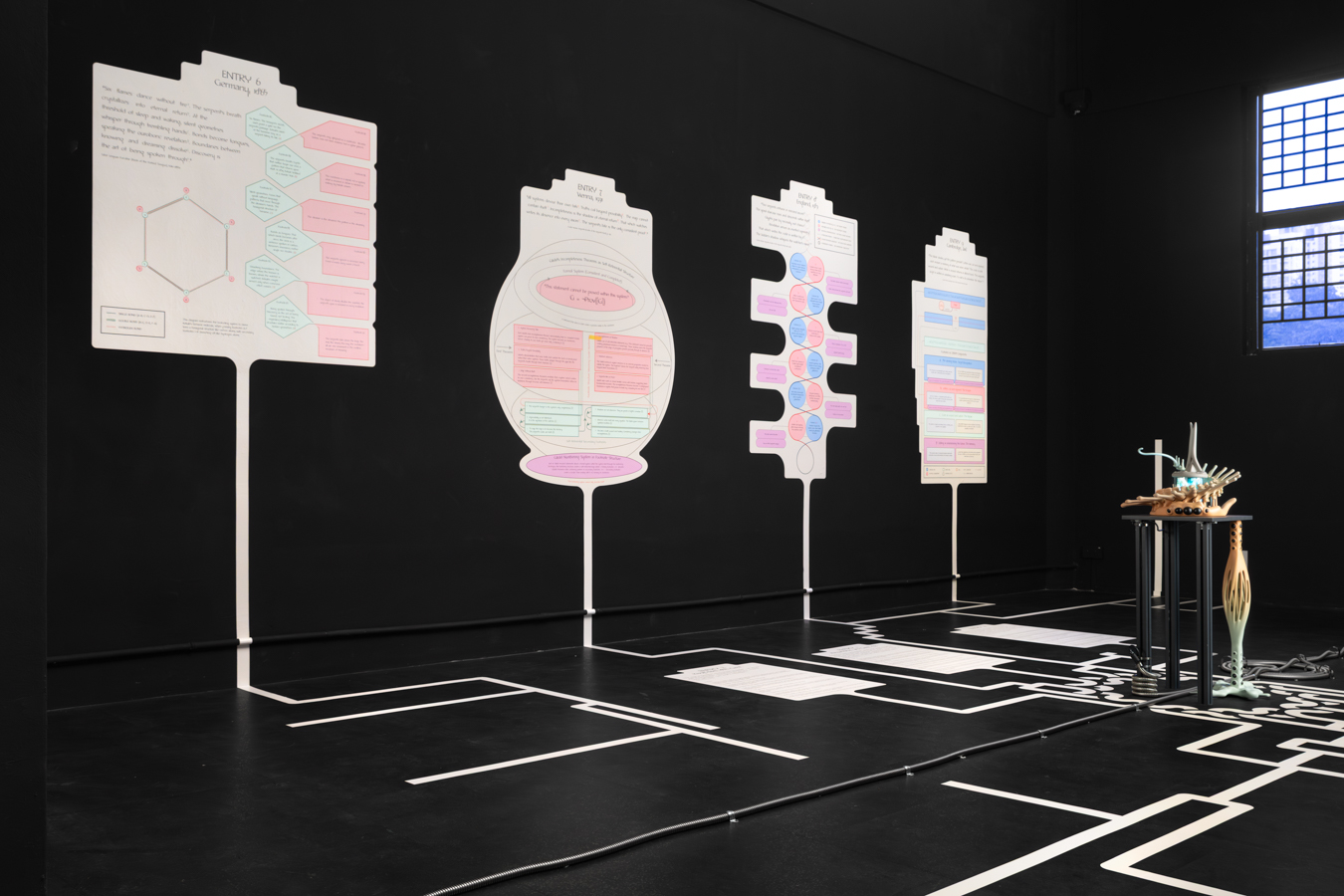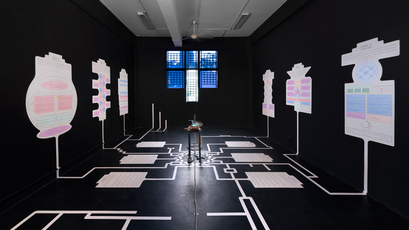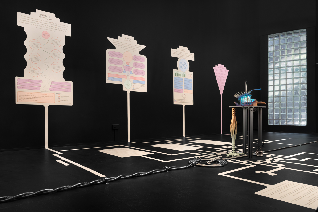 Framing the installation, Ophidian Codex unfolds across the walls as a vinyl text work—a speculative timeline that traces moments of scientific and mystical breakthrough from antiquity to imagined futures. Each fragment layers historical record, fictional narrative, and recursive commentary, creating a metatextual field in which knowledge behaves like a living organism.