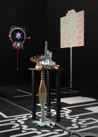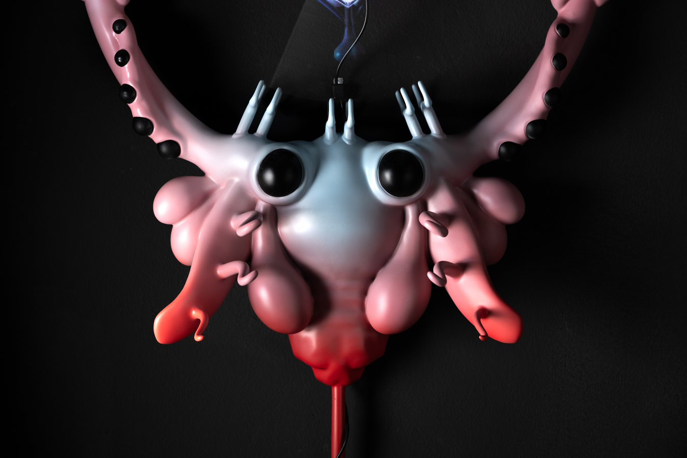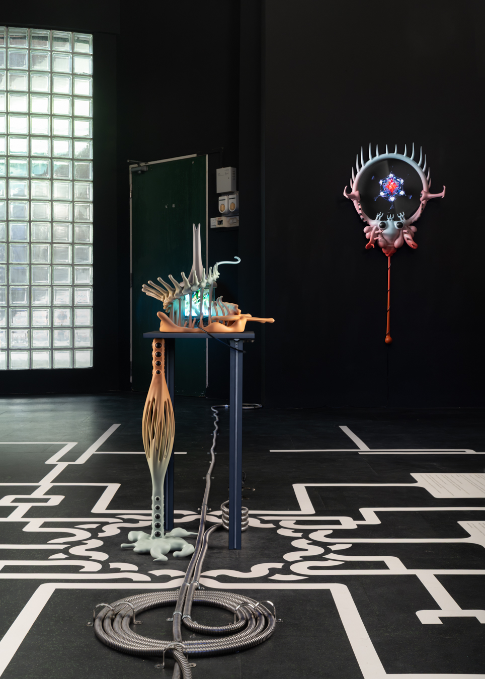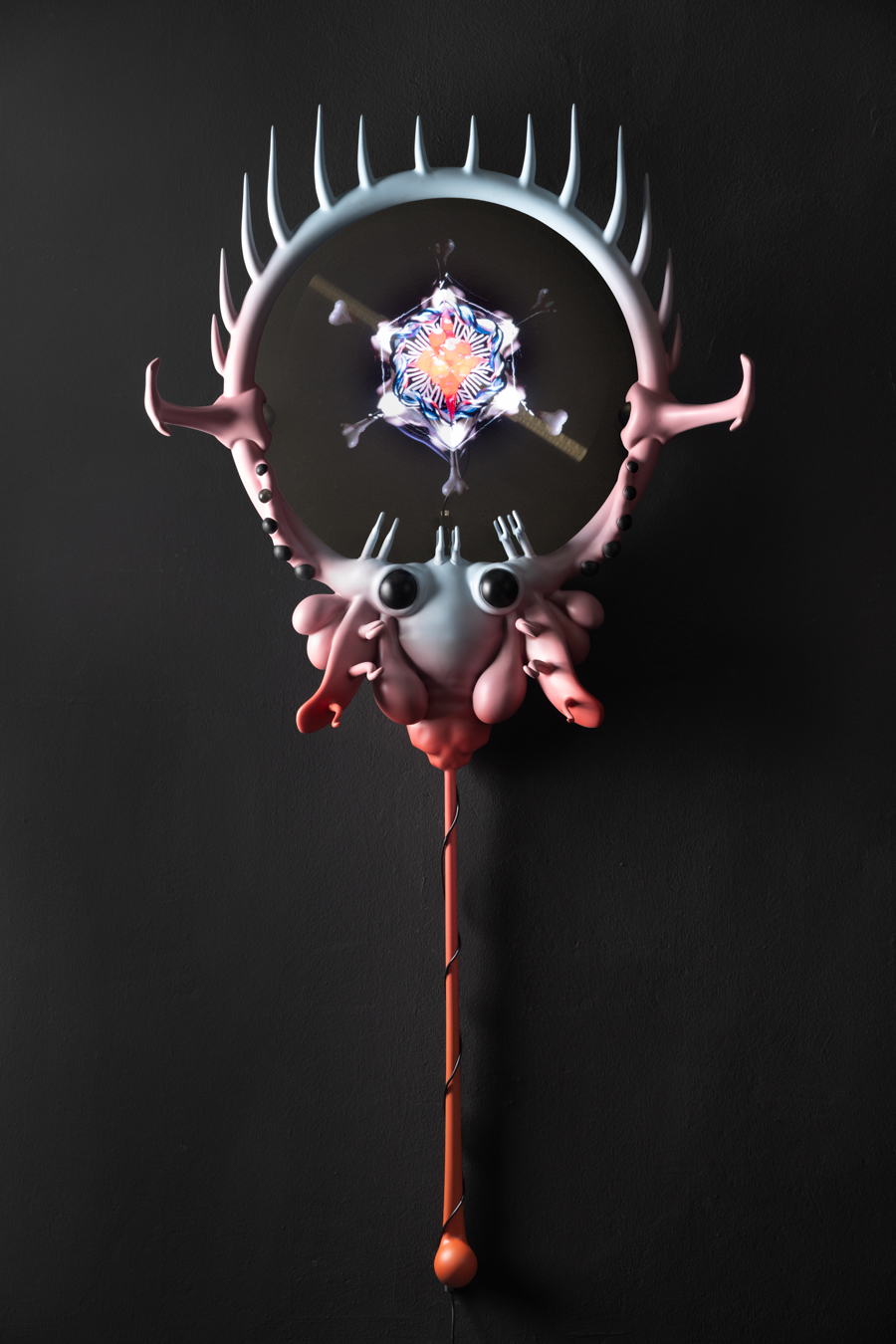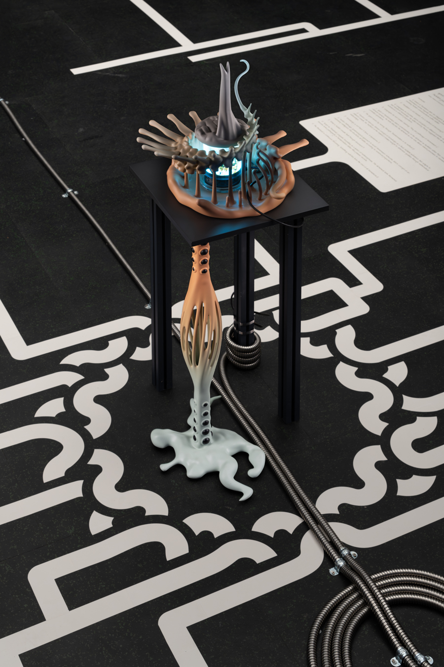 Serpent Vessel, Votive Spiral, and Ophidian Codex form a connected sculptural system exploring how scientific revelation is shaped by intuition, myth, and material recursion. Installed as a spatial constellation of floor sculpture, wall piece, and surrounding text, the works transform the exhibition space into a looping environment where matter, language, and image continuously feed into one another.